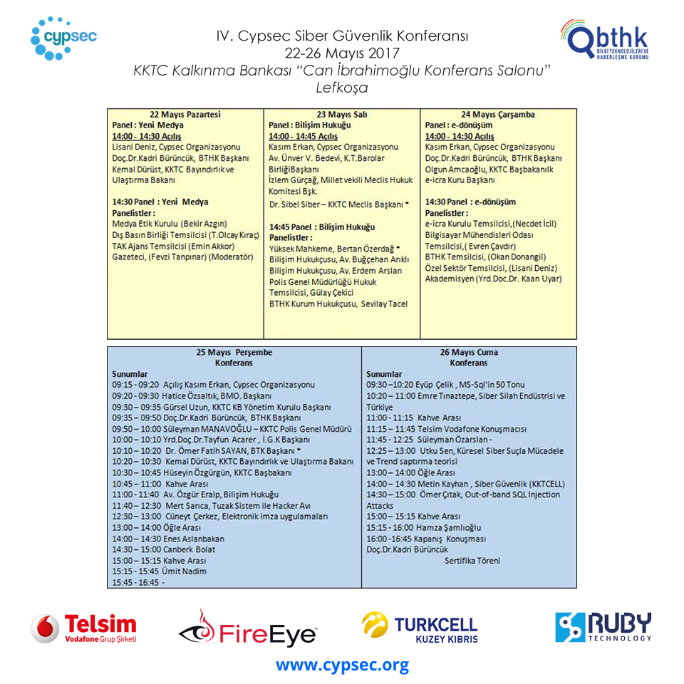 Bilgi Teknolojileri ve Haberleşme Kurumumuzun katkılarıyla gerçekleştirilecek olan 4. CYPSEC Siber Güvenlik Konferansı 22 Mayıs Pazartesi Günü başlıyor.