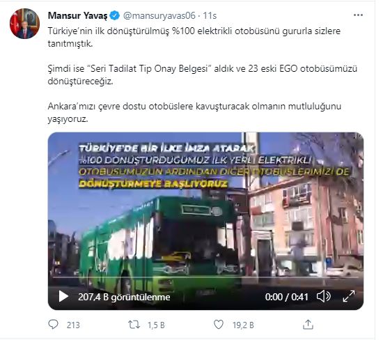 Ankara Büyükşehir Belediye Başkanı Mansur Yavaş’ın 25 Şubat tarihinde prototipini tanıttığı Türkiye’nin Avrupa standartlarında testleri başarıyla geçen, yüzde 100 dönüştürülmüş ilk yerli elektrikli otobüsü için ‘Seri Tadilat Tip Onay Belgesi’ alındı.