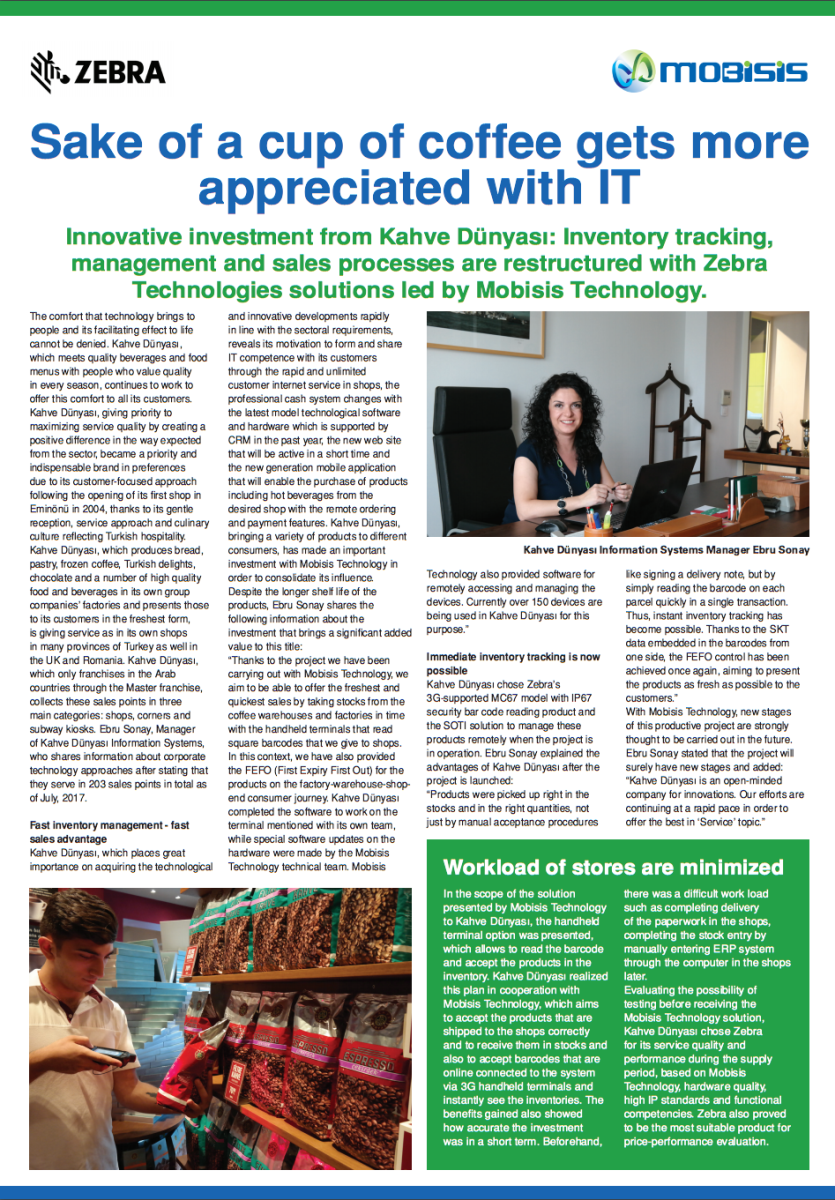 “Mobisis Teknoloji ile hayata geçirdiğimiz proje sayesinde mağazalara verdiğimiz kare barkod okuyan son teknoloji el terminalleriyle Kahve Dünyası depo ve fabrikalarından yapılan sevkiyatları zamanında hızlıca stoklara alarak, en taze şekliyle ve hızlı biçimde satışa sunabilmeyi amaçlıyoruz. Bu kapsamda ürünlerin fabrika-depo-mağaza-nihai tüketici yolculuğunda FEFO (First Expiry First Out- Son Kullanma Tarihi Gelen Önce Çıkar) kurgusunun sağlamasını da yapmış oluyoruz. Kahve Dünyası, söz konusu terminalin üzerinde çalışacak yazılımı kendi ekibi ile tamamlarken, donanım üzerinde müşteriye özel yazılım güncellemeleri de Mobisis Teknoloji teknik ekibi tarafından yapıldı. Bunun yanında, cihazlara uzaktan erişim ve yönetim sağlayan yazılım da Mobisis Teknoloji tarafından sağlandı. Halen 150’nin üstünde cihaz bu amaçla Kahve Dünyası’nda kullanılıyor.” Anlık stok takibi mümkün oldu Kahve Dünyası, söz konusu projeyi hayata geçirirken Zebra’nın 3G destekli, kare barkod okuma özelliğine sahip, IP67 güvenlik standardındaki MC67 model ürününü tercih ederken, bu ürünleri uzaktan yönetebilmek için de SOTI çözümünü kurguladı.