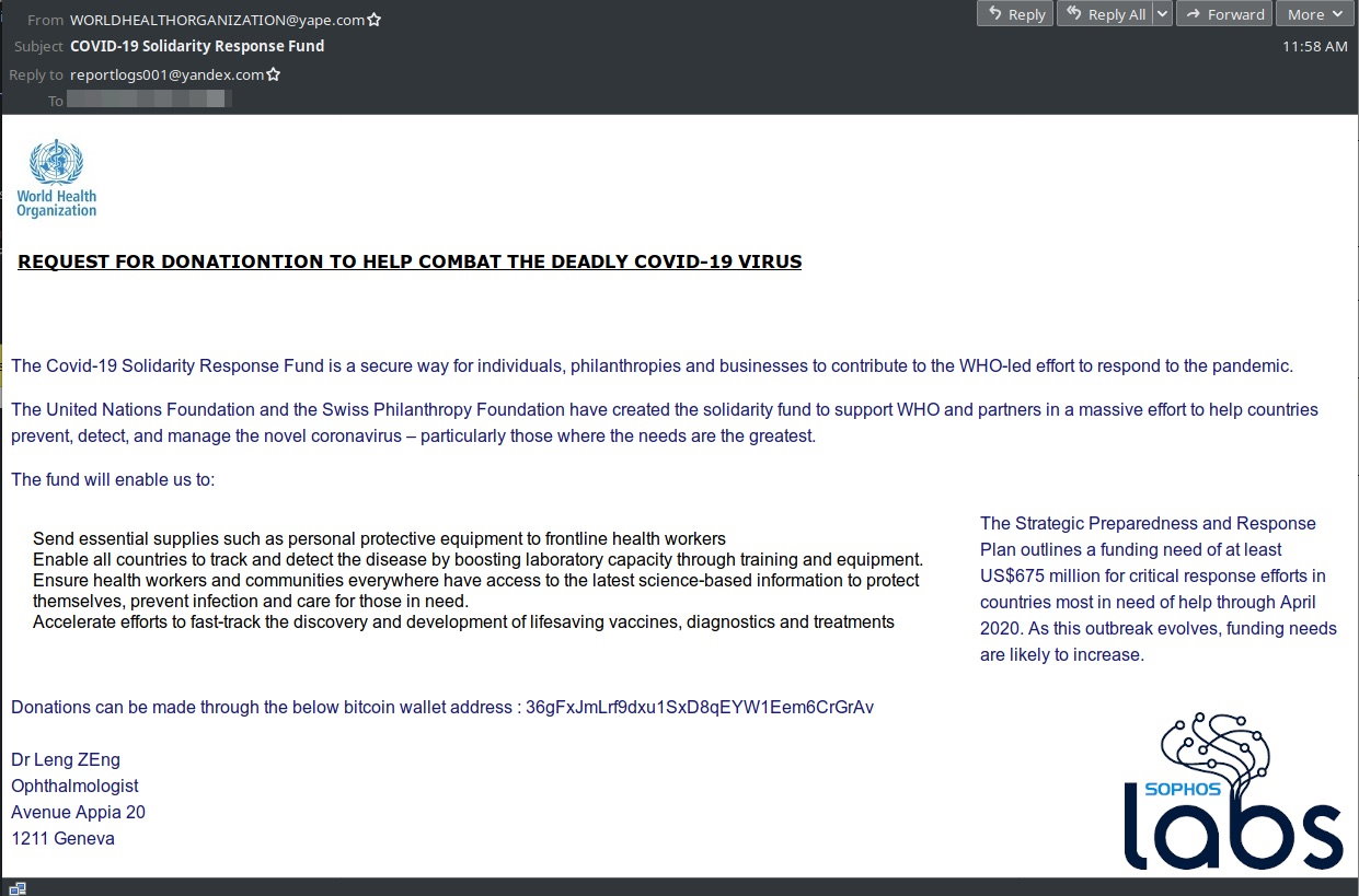 Sophos olarak şu ara tespit ettiğimiz siber saldırıların neredeyse tamamı COVID-19/Corona temasına sahip. Koronavirüse karşı yüzde yüz koruma sağladığı iddia edilen maskelerden işinizi ve ailenizi korumak için sığınak inşa etme planlarına kadar insanları dolandırmaya yönelik pek çok vaat ortalıkta dolanıyor. Fareit ve Trickbot gibi e-postayı öncelikli yayılma yolu olarak kullanan saldırılar, sürekli Hastalıkları Kontrol ve Önleme Merkezi (Centers for Disease Control and Prevention - CDC) ve Dünya Sağlık Örgütü (WHO) temalı e-postalar gönderiyor. Bunların en yeni örneği de Dünya Sağlık Örgütü’nün salgınla mücadelesinde kullanılmak üzere bağış adı altında Bitcoin talep etmek oldu.