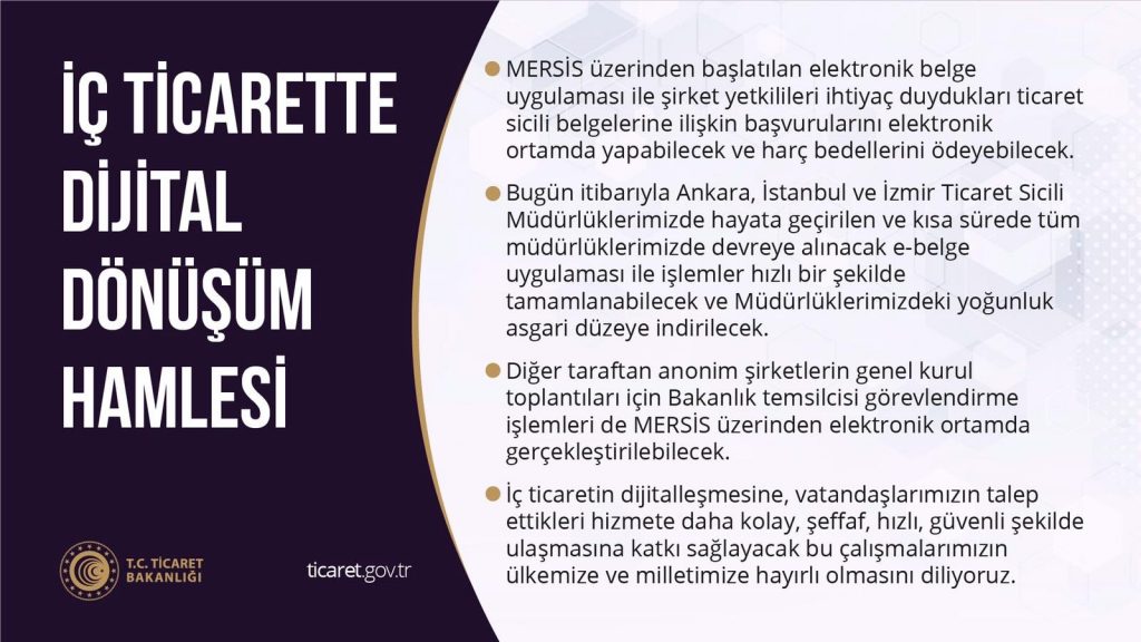 Bu çerçevede, Türkiye'nin önemli dijital dönüşüm projelerinden biri olan MERSİS üzerinden elektronik ortamda yürütülen ticari işlemlerin kapsamı genişletilerek, özellikle yeni tip koronavirüs (Covid-19) salgını sürecinde sosyal temasın en aza indirilmesini amaçlayan ve vatandaşların hayatını kolaylaştıran çalışmalara ağırlık verildi. Bu bağlamda, Türkiye Odalar ve Borsalar Birliği ile iş birliği halinde MERSİS üzerinden başlatılan elektronik belge uygulamasıyla ticaret sicili müdürlüklerine fiziki olarak başvuru yapılmak suretiyle alınabilen ticaret sicili belgelerinin elektronik ortamda temin edilmesi sağlandı. Böylece, şirket yetkilileri ihtiyaç duydukları ticaret sicili belgelerine ilişkin başvurularını MERSİS üzerinden elektronik ortamda yapabilecek ve harç bedellerini elektronik ortamda ödeyerek söz konusu belgeleri MERSİS üzerinden temin edebilecek.