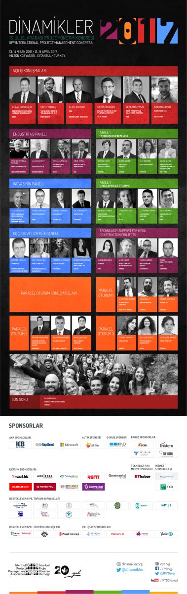 Adı İstanbul Proje Yönetimi Derneği (İPYD) ile özdeşleşen Dinamikler 2017, 18. Uluslararası Proje Yönetimi Kongresi, 13 - 14 Nisan 2017 tarihlerinde İstanbul Hilton Kozyatağı Otelinde gerçekleştirilecek. Kongre kapsamında 15 Nisan 2017 tarihinde ayrıca ulusal ve uluslararası inşaat sektörü profesyonellerinin yer alacağı bir de çalıştay gerçekleştirilecek. Farklı sektörlerden 300’ü aşkın proje yöneticisi ve üst düzey yöneticinin katılacağı ve 12 genel/paralel oturumun gerçekleştirileceği kongrede, 40’ın üzerinde seçkin konuşmacı iletişim, yazılım, inşaat, üretim, enerji başta olmak üzere farklı alanlarda edindikleri proje yönetimi bilgi birikimlerini ve tecrübelerini katılımcılarla paylaşılacak.