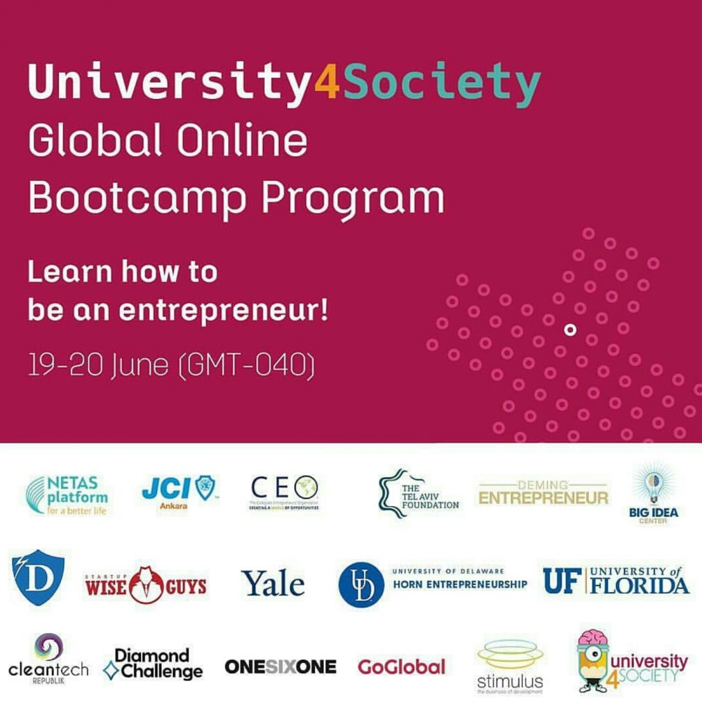 Bu süreçte, alanında uzman mentorlar ve eğitmenler aracılığıyla iş fikirlerini geliştirirken farklı bakış açıları kazanacaklar. Finalde, ekipler hafta sonu boyunca sürekli üzerinde çalıştıkları fikirlerini sektördeki önde gelen isimlerin jürisine sunacaklar. University4Society, Global Online Bootcamp etkinliğinde Yale University, The Big Idea Center from University of Pittsburgh, University of Florida, Horn Entrepreneurship from University of Delaware, Deming Center for Entrepreneurship by University of Colorado, The Tel Aviv Foundation, Stimulus, Startup Wise Guys, Rockstar, OneSixOne, JCI Ankara, GoGlobal, Draper University, Diamond Challenge, Collegiate Entrepreneurs’ Organization, CleanTech Republic ve MyIncubator ile partner oldu. Daha önce bir iş fikriniz varsa veya sadece girişimciliğin temellerini öğrenmek istiyorsanız, University4Society 36 saatlik bir Bootcamp ile sizlere fırsat yaratıyor. İki günden kısa sürede, bir iş fikrinizi geliştirecek ve dünyanın her yerinden olan girişimciler ile global network ağını kullanarak fırsatınızı artıracaksınız.