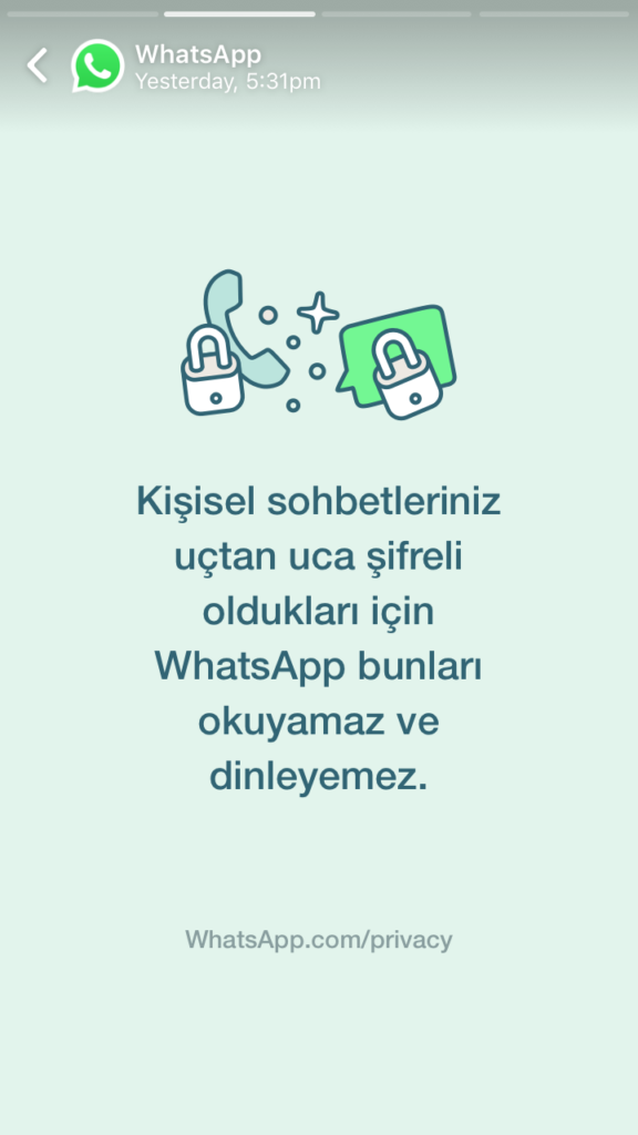 "Gizlilik Politikamız hakkında paylaştığımız son güncellemeden bu yana Türkiye'deki kullanıcılarımızdan birçok soru aldık ve bu soruları yanıtlamak istiyoruz. Bu sabah itibariyle Türkiye’deki kullanıcılarımıza, WhatsApp'ın ve Facebook’un mesajlarınızı göremediğini tekrar teyit eden özel bir durum mesajı göndermeye başlıyoruz."